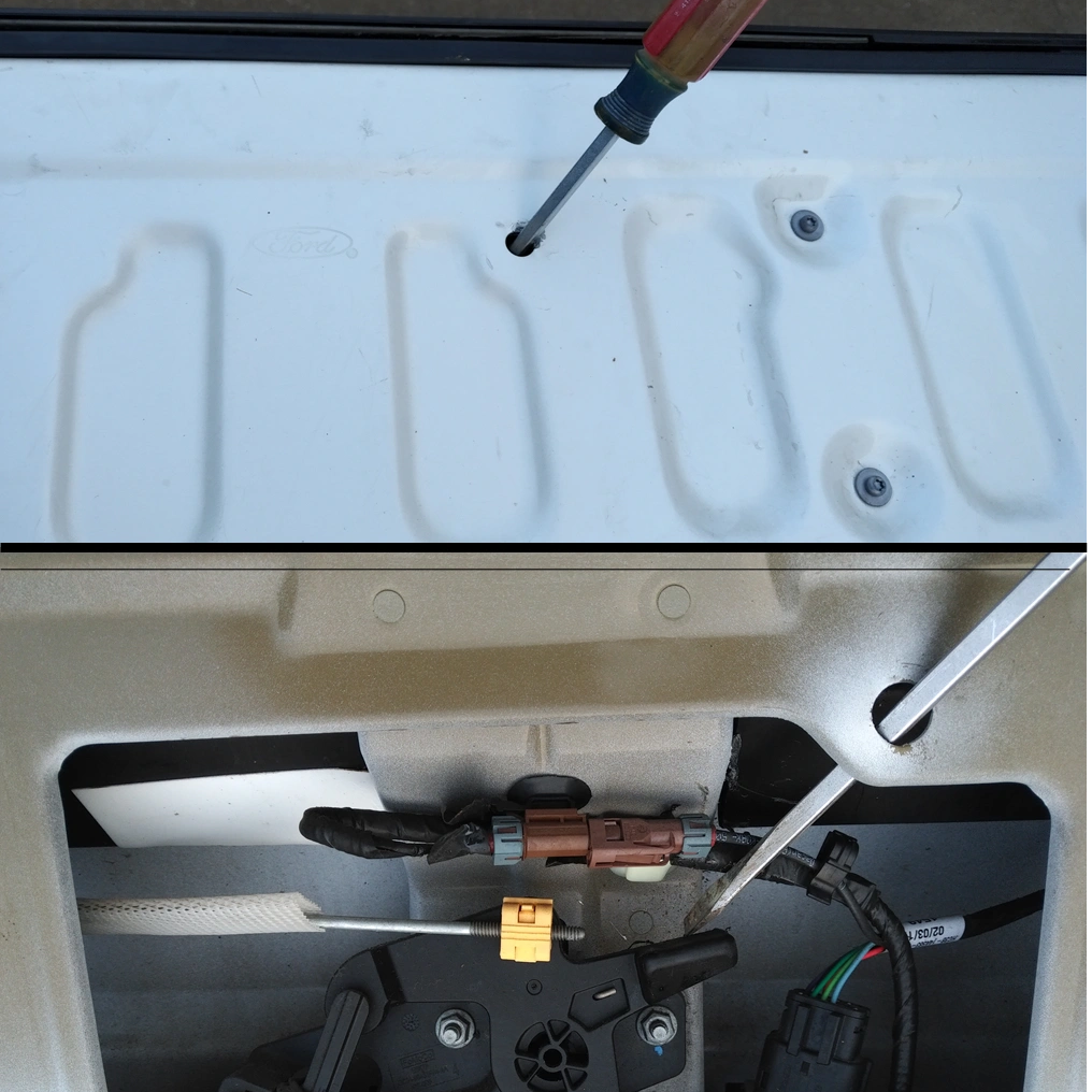 A second method to unlock and open a tailgate is through a hole in the center of the bed side of the tailgate.